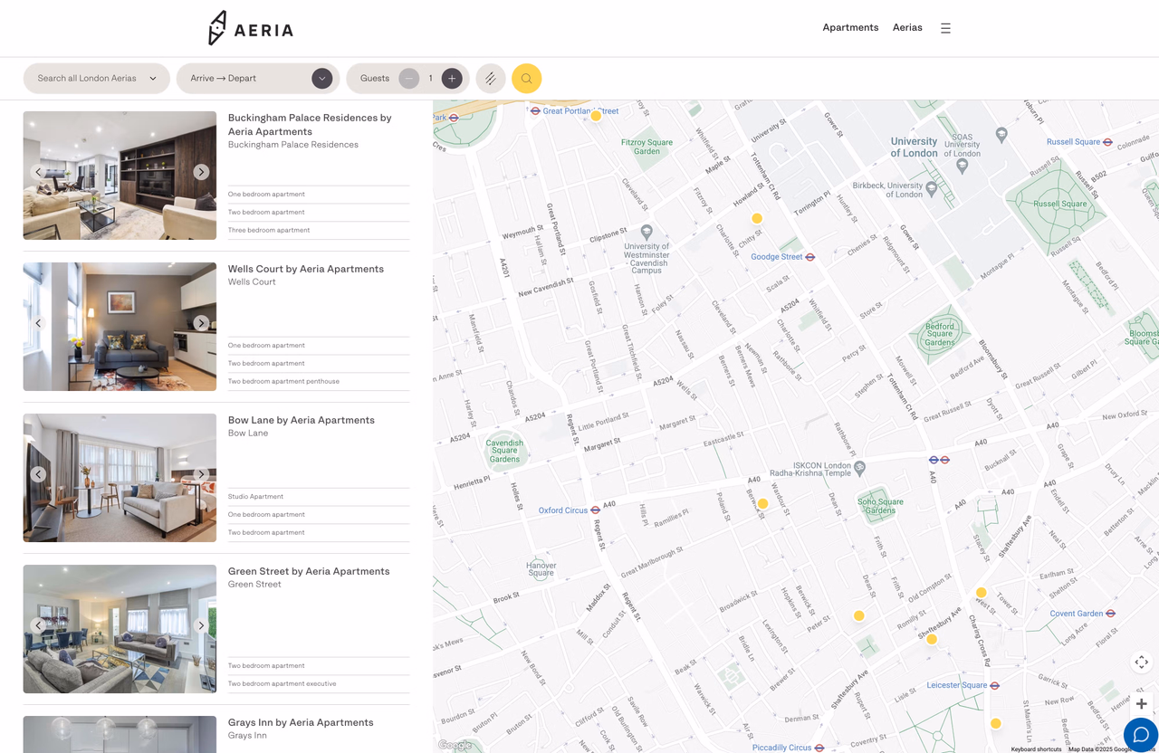 We were asked to develop a new website for Aeria Apartments, with the key requirement being to make it easy for users to search for apartments available in a specific date range, in certain areas and with specific features and facilities. An important requirement was also to present useful, curated content for each area where apartments are present.
