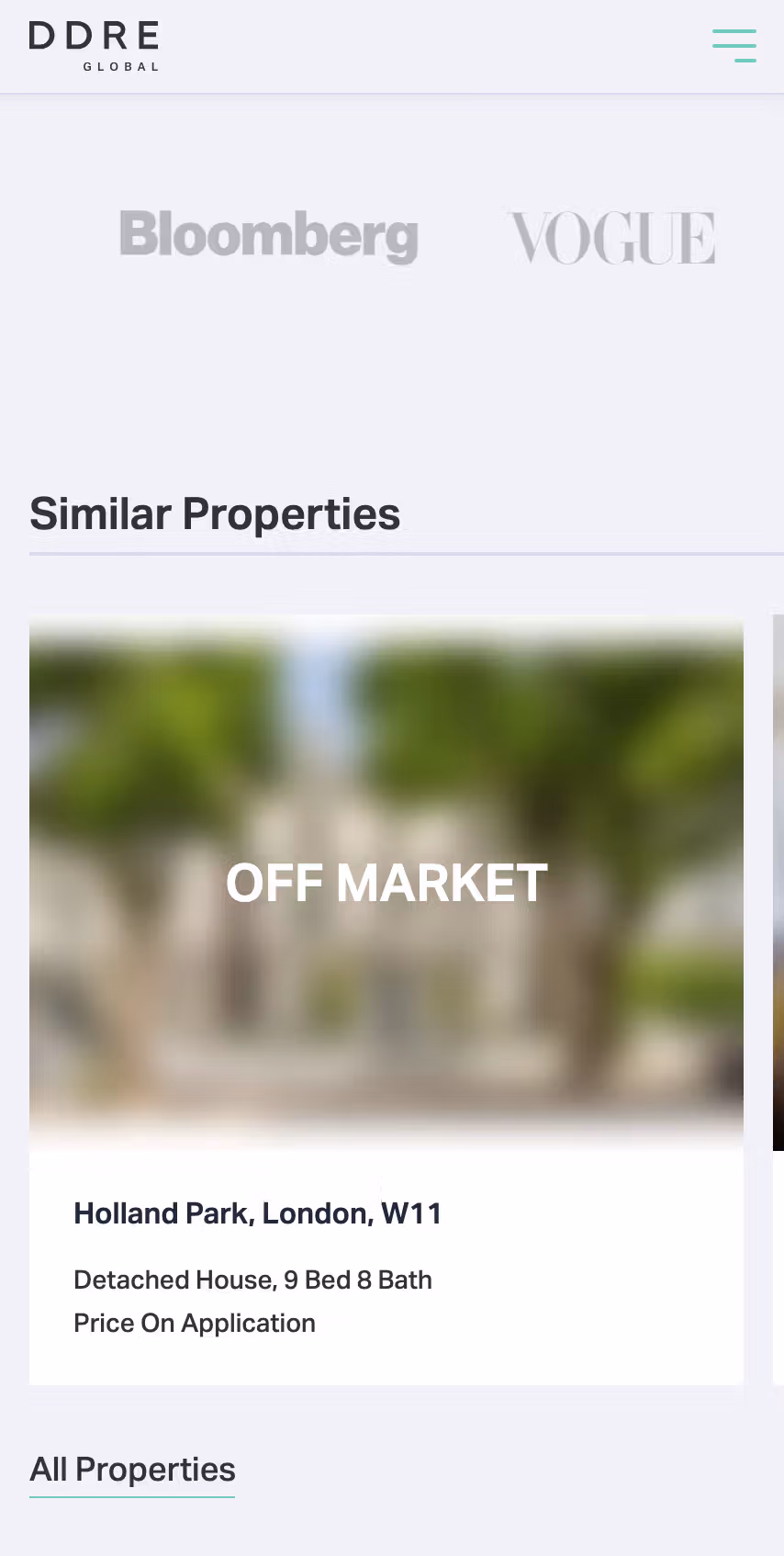 Sanity CMS was built into the website to allow the marketing team at DDRE to update and add content in-house. We integrated both of DDRE's estate agency CRM's into the website for automatic property updates, as well as developing functionality that allows DDRE to set a property as 'off market', restricting property details access to a curated list of customers.